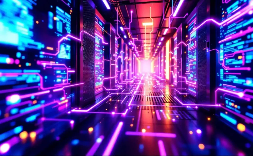 Fabrikhalle mit Maschinen und Monitoren